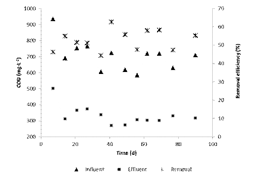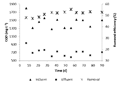 Average COD concentration at the end of the biological treatment was 674.0 mg·L-1 ranging between 583.9 and 764.0 mg·L-1. This COD remaining was higher by approximately 50% of the discharge limit permitted in Venezuelan environmental regulations 27, and therefore, must be removed by other non-biological methods 1)(15)(19).