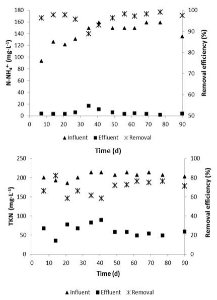 Finally, the effluent of the integrated system (biological + physicochemical treatments) had a final total nitrogen concentration of 35.1 mg·L-1, being less than 40 mg·L-1 which is the maximum concentration permitted by Venezuelan laws 27. It was demonstrated that the limiting step to remove nitrogen during biological treatment was ammonification, but the remained organic nitrogen was removed during the ulterior physicochemical treatment.