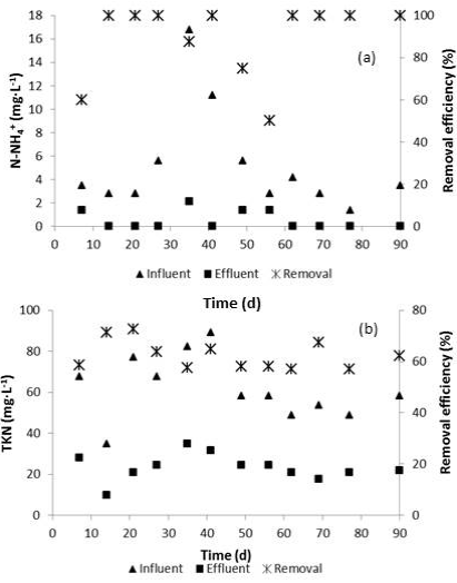 At the end of the biological treatment, the concentration of organic nitrogen, obtained by subtraction of NTK and N-NH4+, showed small variation between the influent and effluent of the SBR (64.4 ( 14.6 and 56.9 ( 12.8 mg·L-1). The concentration of N-NH4+ (4.2 mg·L-1) was minimum as compared to the content of organic nitrogen. Based on that, it was necessary to apply a post-treatment in order to remove the remaining organic nitrogen and to regulate N-NOx- concentration, which was slightly higher than the limit established in Venezuelan laws for discharging in bodies of water (≤10 mg N-NOx-·L-1).