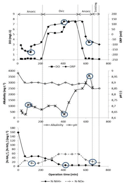 Over the entire working period of the reactor, the pH (Orion 3 Star Series), ORP (Sper Scientific 850088) and DO (Thermo Orion 862A) were continuously monitored by electrodes submerged in the mix liquor (Figure 1). Nutrient concentration (N-NH4+, N-NO2-, N-NO3-) and alkalinity were measured every hour during the SBR cycle 24, while online data were taken each 5 min. ORP, DO and pH were measured during SBR evaluation to determine a correlation between them and the nitrification/denitrification processes.