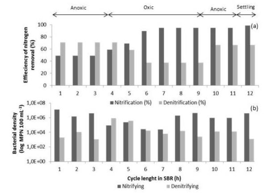 The presence of nitrifying microorganisms tended to increase its density during the aerobic phase of the biological treatment. Eight hours after the cycle began, nitrification removal efficiencies reached the highest value (94.9%) and the maximum bacterial density was registered between hours 8 and 9 of the cycle. On the other hand, there was an increase in the population of denitrifying at the end of the first anoxic phase. This behavior was similar to that described by Rodríguez et al. 28, who concluded that the maximum density of nitrifying and denitrifying was observed at the time when ammonium and organic matter removals were the highest.