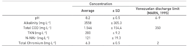 The industrial influent was collected from a tannery located in the city of Barquisimeto, Venezuela. Wastewaters from the different processing phases of leather production (liming, tanning with chromium and dyeing - degreasing) were mixed, settled and stored in balancing ponds, located in the same industry. The pond acted as a pre-treatment of the wastewater for the amendment of total solids and precipitation of chromium (due low solubility of the metal at pH of the effluent). The pre-treated wastewater was used as feed to the SBR. The average physicochemical composition of tannery wastewater is shown in Table 1.