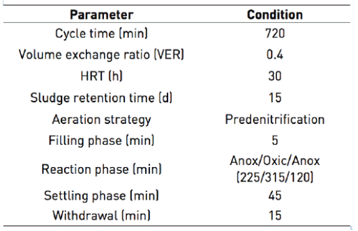 To begin the biological process, the SBR was seeded with biomass from the aeration tank of a tannery treatment plant (located in the city of Yaritagua, Venezuela), which employed a continuous flow suspended growth configuration. The biomass was acclimated to the wastewater characteristic and SBR conditions for a period of 40 days. After the acclimation period, the biomass exhibited stable nitrification (>70%) and good settling characteristics (<30 min), which is an important requirement for SBR process 23.