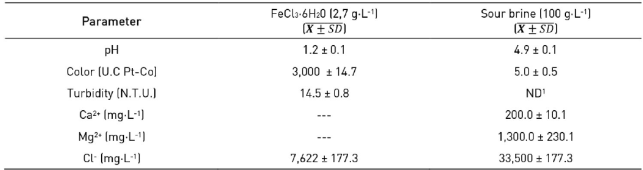 Post-treatment consisted of coagulation/flocculation tests performed in a Jar-Test device. During the investigation, a mix of reagents was used: Ferric chloride hexahydrate (FeCl3·6H20), as a coagulant (Fluka Chemicals, UK) and an agro-industrial waste (sour brine), as adjuvant (Table 3). Adjuvant was obtained from a company dedicated to produce salt by sun evaporation (Maracaibo, Venezuela). Characteristics of coagulant and adjuvant as color (2120-C), turbidity (2130 B), calcium (3500-Ca-B), magnesium (2340-C and 3500-Mg-B) and chloride (4500-Cl--D) were measured following the procedures of Standard Methods 24.