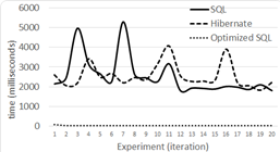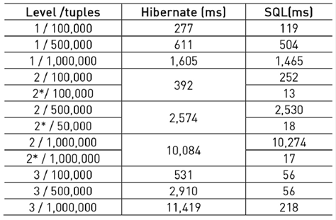 Our average response times, for levels one and two, show that the performance of Hibernate and non-optimized SQL queries is similar in a DB with few records and simple relationships. This behavior was already described by 17. However, when going from half million records to one million, we can see that Hibernate and non-optimized SQL queries’ response time is strongly non-linear. This non linearity is shown for level 1, 2 and 3 in Figure 14 and 15, where performance times grow tree and almost five times respectively.