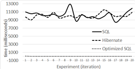 Secondarily, even though we performed tests for three DB sizes only, Hibernate and non-optimized SQL queries’ average response time vs DB-size curves appear to be strongly non-linear. Plus, the ratio of optimized-SQL and Hibernate-average-response-time is not constant and grows with the DB size (see Figure 15 and 16), suggesting that they belong to different complexity orders. Clearly there is a big gap between both Hibernate and non-optimized SQL queries, when compared to optimized SQL queries. However, more research is needed to properly determine the complexity order.