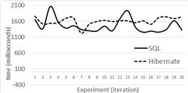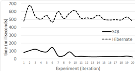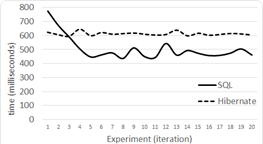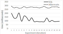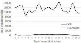 To run the application we used Apache 2.4.4, MySQL 5.6.12 and Hibernate 4.2.2. Final software versions. Also, the experiments were made in a Samsung ultrabook, Intel Core I5-3337U CPU @1.80GHz x 4, 4GB DDR3 RAM, and 64 bits Windows 8. We ran all test the same day, in the same machine, with the same processes load, avoiding tune-ups that could give advantage to Hibernate or SQL queries.