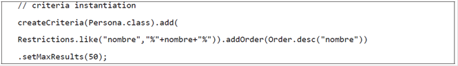 All of our Hibernate DAO methods for retrieving object trees are alike, the only code section that changes corresponds to the query criteria, see Figure 20. This criteria was constructed using Session’s createCriteria() method. Where <OBJ_CLASS> is the type of the resulting data, and <CLASS> is the type of the List used to capture the Hibernate API result, generally both classes are the same.