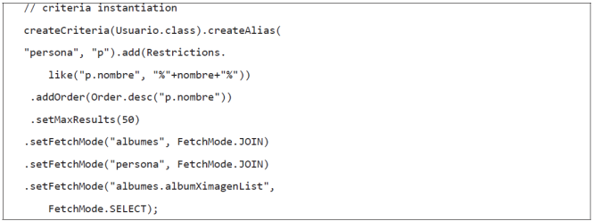 Our first attempt to build the required criteria was to set <OBJ_CLASS> equals to Usuario and, in addition to level 2 query restrictions, we modified AlbumXImagen’s fetch mode from SELECT to JOIN. However, this approach resulted in this execution exception: "Request processing failed; nested exception is org.hibernate.loader.MultipleBagFetchException: cannot simultaneously fetch multiple bags". Not being clear from the Hibernate’s documentation the nature of this error, we assumed it was caused by the join depth complexity. The reader must remember that every Usuario has a List of Albums and every one of those also has a List of AlbumXImagen, see Figure 3.