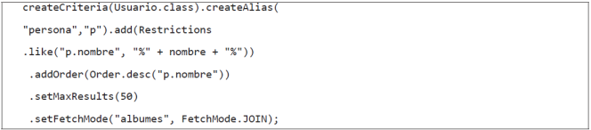 This approach has the inconvenient that even when it solves the execution problem, the way classes were mapped causes both album and albumXimagenList attributes are always loaded. This lead queries to poor performance when those data are not required, take our level 2 queries for example. On this ground, we defined the required criteria as shown in Figure 24: