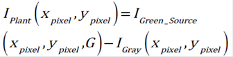 At this point, source image is converted to grayscale intensity whereby the hue and saturation information is eliminated while retaining the luminance. All components in XY space corresponding to green value on image are subtracted from the corresponding element in grayscale array 1. This method is one of the most practical ways of separating plants from soil.