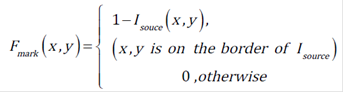 Because of feature extraction based on area, it is appropriate to fill in the holes in the image. Thus, evaluation in the next step is enhanced since compact objects are obtained. For this purpose, an algorithm based on morphological reconstruction is used 15. This method uses 4 or 8 connected neighborhood pixels to evaluate the resulting image 16. The algorithm calculates a marked image stemming from source image borders using (3):