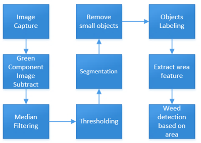 The approach of the project is achieving a baseline method for developing a real time weed detection system through binary classification when vegetation is detected, that is, to separate soil and plants, then, to apply a feature extraction for discriminating weed. First, Green plant detection algorithm is implemented to remove soil from image such that image information is reduced. The next steps of algorithm focus only on vegetation, then, median filtering removes noise as “salt and pepper” with advantage of preserving edges. Third, the previous output is converted to binary; at this point, small objects are removed in order to avoid outliers. After, the pixels connected around their neighborhood are labeled, thus, all objects in the image are identified. Finally, area calculation for each object is done. With the values obtained, we set a threshold to differentiate weed from crop, such that the method is a feature extraction criterion based on size. Figure 1 shows the flow chart corresponding to the process described above. The algorithm was performed using MATLAB R2015.