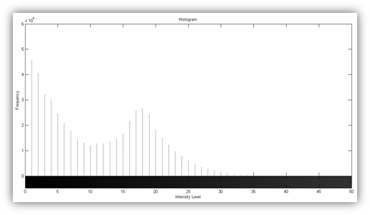 The selection of threshold may not be obvious for human eye just to see the image. To deal with this, the parametric and unsupervised most famous and practical method is used. The Otsu method (14, estimates optimal threshold to segment through an exhaustive search of maximum variance between classes in gray levels. The selection of an appropriate threshold is carried out with image histogram, taking the value of the valley formed by two peaks, corresponding to the light and dark areas. Figure 5 shows the intensity level on the horizontal axis up to 50; however, the total value for the intensity level is 0-255.