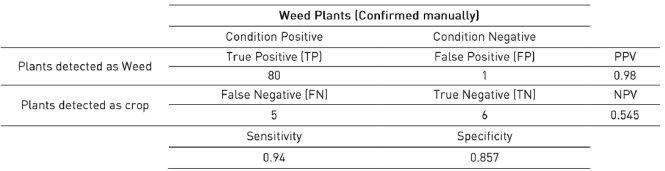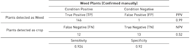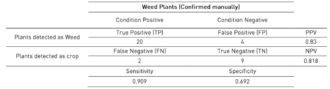The sensitivity values shown in this section are around 0.90, which indicate a good performance of the proposed algorithm for detecting plants as weed correctly. Similarly, the specificity values near to 1 represent the ability of the system to detect correctly plants as crop. The positive predicted values are greater than 80 percent, whereby, most of the cases identified as weed are true positive. In contrast, the negative predicted values are near to 0.7, which means a 30 percent of false negatives obtained when weed size is greater than or near the crop size; this behavior is presented in Figure 10 and Figure11.