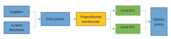 The literature on humanitarian supply chain has identified different models to determine the configuration of actors, from donors to recipients or the affected people by the disaster. Generally, the literature reports that humanitarian supply chain is composed of three echelons. Donors compose the first echelon, which can be tens of thousands of suppliers sending goods to the disaster area. A second echelon would be found in the different points of entry; these activities centers are mainly located in ports and airports. The last is made of destiny points where supplies are delivered to victims. As with donors, these delivery points can become tens or even hundreds of thousands of people [4].