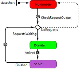 According to the above discussions, the following states are defined for the donor agent: 1) Donor agent is initially in state “No donate”. 2) When its sensors are activated, the donor agent goes to “Donate” state. 3) “Serve” state, in which the donations are delivered to the impacted area. Figure 3, presents the state diagram for this agent.