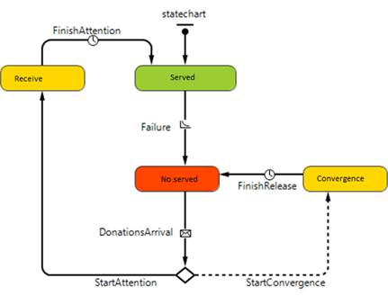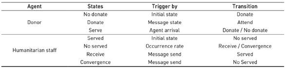 The transition from the “Served” state to the “No served” state occurs because the system failure or because the absence of supplies. The transition to the “Receive” and “Convergences” states are triggered by sending a message to the donor agent, which answers this message with the humanitarian aid. Table 3 summarizes the states and its transitions for both modeled agents.