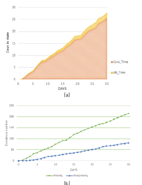 The probability that a donation is a priority is variable over time. The equation of the constructed variable, "Probability of priority", presented in Table 7, set the limits of this probability between [0.4 to 0.6]. Additionally, service times and convergence (TATT and TCOV) were modeled as random variables following a triangular distribution (0.5x, x, 1.5x), where x represents attention or releasing time. On the other hand, we define ten stores for the scenario running and a replication length of 30 days.