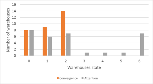 The greater the number of available warehouses, the longer the spent time of the system in the convergence state. This phenomenon occurs because the non-priority donations are uniformly distributed between the warehouses. A centralized warehouse allows decreasing the amount of non-priority donations that arrive downstream the humanitarian supply chain. However, centralization requires information exchange and coordination among actors to help to reduce the impact of uncertainty.