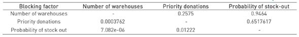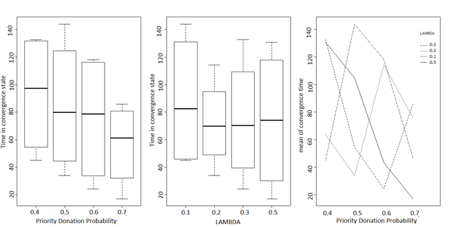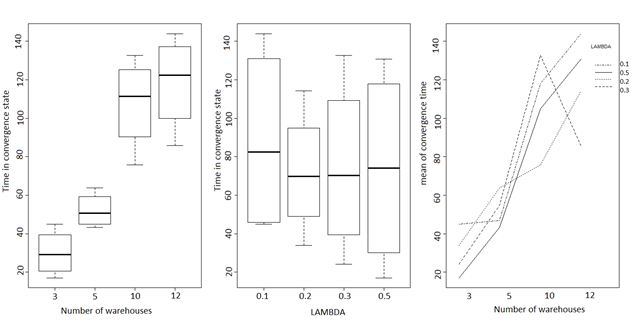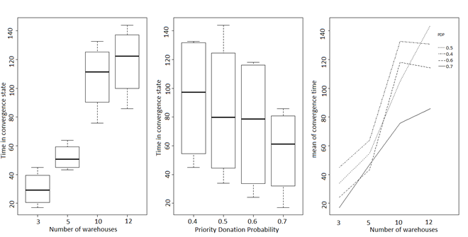 In summary, the number of warehouses and the probability of priority donations explain the spent time of the convergence state. Nevertheless, there is no enough statistical evidence to confirm that the stock-out rate has a significant effect in the time of the convergence state.