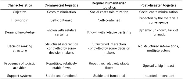 A first step in the characterization of the humanitarian logistics is differentiating it from the commercial logistics. Table 1 presents the main differences [4].