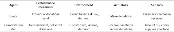 The main objective of this agent is to provide demand supplies to the disaster area. Since the donor agent is not located at the disaster site, there is a partial perception. In order to update the agent state, two kinds of knowledge are required. First, we need to know how the system evolves without the agent involvement, and then how its actions affect the system.