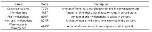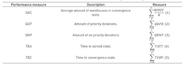 Table 6 shows the defined performance measures. These metrics must be build according to the modeled environment.
