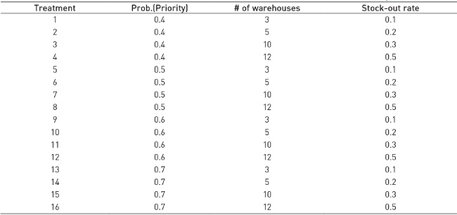 An experimental design was conducted to analyze the effect on the convergence state of several factors such as the probability of the priority donations, the number of warehouses and the stock-out rate. The method used for the experiments is a randomized block design. Table 8 shows the treatments utilized in the experiments.