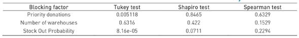 Figure 7 shows the results of the adjusted linear model using as blocking factor the probability of priority donations. In Figure 7(a), we observe an effect of the number of warehouses on the convergence time since the means in the boxplots are dispersed. In Figure 7(b), we find that there is no a significant difference between the treatments means related to the stock-out rate. On the other hand, the interaction graph in Figure 7(c) shows a limited interaction between factors. Besides, we made the Tukey non-additivity test in order to confirm the interaction assumption. The p-value for this test was 0.005118, so the non-additivity hypothesis can be discarded. The normality and homoscedasticity assumptions were revised using the Shapiro test with correspondent p-values of 0.8465 and 0.6329.