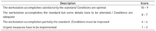 Creating a complete and comprehensive instrument required the use of the ILO’s “introduction to work study” and the works of Frieling et al. (12) and Hayes et al. (13). The instrument comprises seven major sections, each evaluating different components of the workstations studied (14) (see final instrument in appendix). Section one evaluated physical load at both dynamic and static conditions as these may cause back problems. Section two was related to the thermal environment and it analyzed if the temperature, clothing, ventilation, and protection were appropriate. The two following sections -three and four- studied noise and illumination as they can be sources of auditory problems and visual tiredness. Section five evaluated the mental load by considering aspects such as the complexity of the task and time pressure. The next section focused on psychosocial aspects of work through the assessment of the relationship between coworkers at both a peer level and managerial levels. Finally, section seven evaluated whether: (a) the working time was between human and legal standards, and (b) payment was fair (see Appendix for final instrument). The grading scale used in this study was developed using the ILO standards (Table 1).