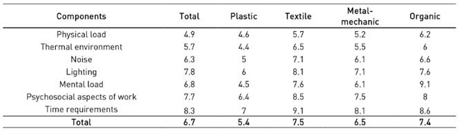 Work conditions scores per company were averaged and showed in Table 2. The lower average scores, which represent the worst performance, were reported in the physical load (4.9) and thermal environment (5.7) components. These were the most urgent aspects requiring improvement in the studied companies. The time requirements component was the best performing factor (8.3). The Plastic sector showed the lowest overall scores among the industries analyzed (5.4), whereas the textile sector was the best performing (7.5).