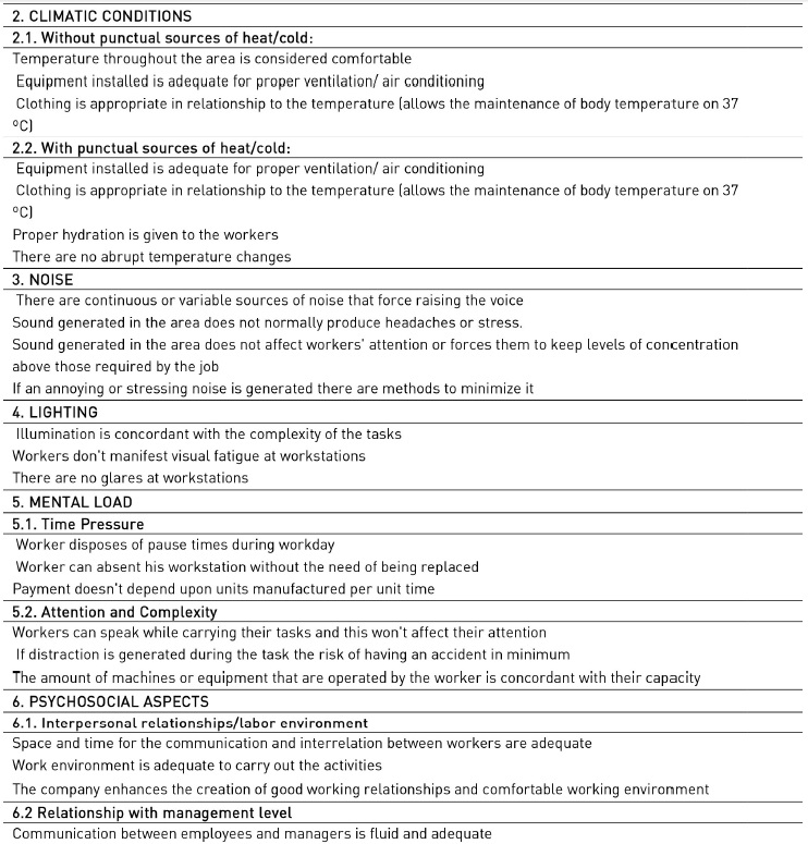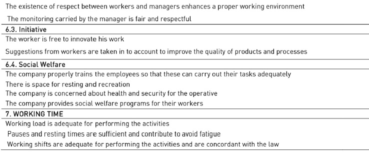 The investigation highlighted that the companies have both strengths and weakness in different topics of work conditions. Most of the strengths are associated with psychosocial aspects of work, illumination and time requirements. Conversely, the deficiencies found are related to climatic conditions, physical load, noise and social welfare programs. One characteristic that influenced these results was that the companies studied were SMEs and, therefore, their comparability to large enterprises is low.