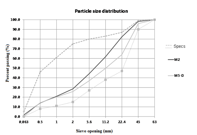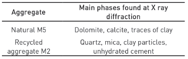 Mineralogical composition of both aggregates was assessed aided with X-ray diffraction tests. Table 2 presents the most common phases found in both aggregates. M5 aggregates are of calcareous origin, with calcite and dolomite as main phases, whereas M2 aggregates seem to be of mixed origin, with several phases, including anhydrate cement, which is typical of a mix recycled aggregate.