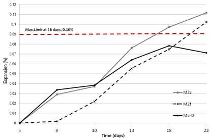 Figure 10 presents the results of measurement of volume changes in mortars according to the accelerated test. The norm ASTM C 33 explains that if after 16 days of application of the test, the expansion of the mortar prisms remains under 0.1%, the aggregates are considered inert; for values between 0.10% and 0.20% the aggregates can be considered either inert or reactive. The mortar series M2c reaches the highest values of expansion after 18 days, while the other series M2f and M5 remains well under the limit of expansion accepted. The reduction of expansion in mortar series M2f referred to M2c can be explained by the presence of the very fine fraction under 63 µm, which increases packing of the cement matrix and refines the pore structure, thus preventing alkalis to go deep into the matrix.