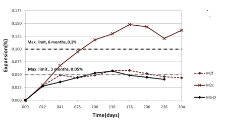 Figure 11 presents measurement of volume changes in mortars following the ASTM C 227 protocol. The norm ASTMC C33 refers that the aggregate is potentially reactive if expansion levels are higher than 0.05% after three months of measurement, and are higher than 0.1% after six months of measurement. If a mortar exceeds 0.05% at three months but remains below 0.1% at six months, the aggregates are yet considered inert.