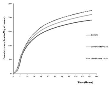To assess the reactivity of the material under 63 µm, the increase in heat of hydration in a cement paste where 30% of cement is substituted by the fine powder was measured. A reference paste is made with inert filler instead of the powder. Figure 3 presents the calorimetric curves for the three pastes evaluated. The system with cement-filler shows an increase of the heat of hydration per gr of cement in reference to the pure cement system, due to the dilution effect, as referred in the literature, that is, the cement grains have more water available and can thus hydrate better. The system cement-powder shows only a slight increase above the cement-filler system, which is attributed to pozzolanic activity of the powder. A more reactive pozzolan should have a higher increase of the heat of hydration due to the pozzolanic reactivity [40]. This could indicate that the pozzolan evaluated -powder with size under 63 µm - does not attain a high reactivity.