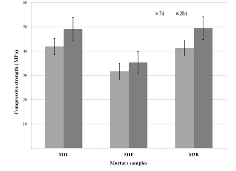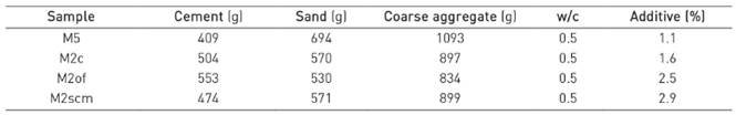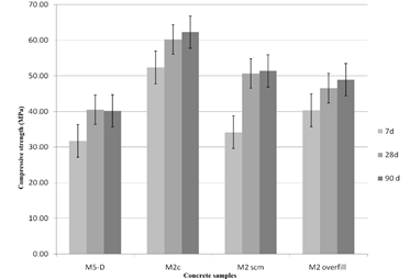 Figure 7 presents the results of compressive strength of the studied series to the age of 7, 28 and 90 days. Considering that all the mixtures have similar W/C ratio, it is expected that all of them attain similar compressive strength. The differences can be related with problems of the aggregates. The series M2of and M2scm have similar compressive strength to that references M5.