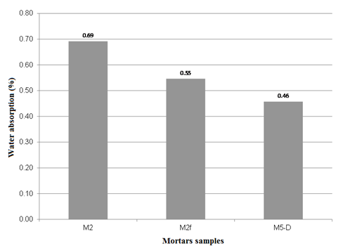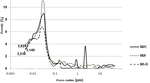 Figure 5 presents results of water absorption for the mortars M2, M2f and the reference M5. The series M2f yielded lower water absorption than the series M2, which indicates the impact of the fines under 63 µm on the connected porosity. Mercury Intrusion Porosimetry tests, presented in Figure 6, do confirm the improvement of the pore structure apparently due to the contribution of the fines under 63 µm. The mortar series M2f presents an increase on the percentage of pores on the sizes 0.01-0.1 µm, that correspond with a refinement of the pores structure, caused probably by the presence of these fines particles that fill pores and discontinuities and block the system of pores, thus decreasing the connectivity of the pore system [41]. Some authors obtained similar results, a reduction of water absorption of the mortars due to the filler effect of fines particles of recycled aggregates [5] [16].