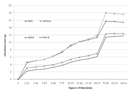 Figure 8 presents the results of water absorption by capillarity. The mixture M2of, with excess of fines, attains similar results of absorption to the reference series, and much lower than the two remaining series (M2c and M2scm). This can be explained through a refinement of the pore structure likely caused by the presence of fines, which is consistent with results in mortars presented in this paper before.