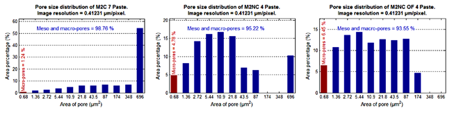 It is commonly accepted that engineering properties are related to porosity, thus it is better to characterize the pore system than the solid phases formed during cement hydration [33]. For this reason, the strategy of this paper was to assess the area percentage on the pore size distribution determined at the SEM-BSE image.