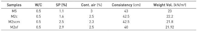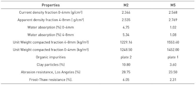 Figure 1 presents the particle size distribution of fine aggregate. Both aggregates M2 and M5 have a similar grain size distribution, which can be helpful at the time of the comparing the results. Table 1 presents the physical and mechanical properties of natural and recycled aggregates.