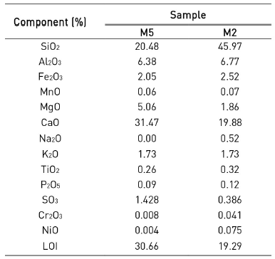 The chemical composition of the powder of recycled aggregate, M2, was determined with X-rays Fluorescence technique. Samples of natural aggregates, denominated M5 for the comparison, were included. Table 3 shows the results of chemical composition that is consistent with the mineralogical composition presented.