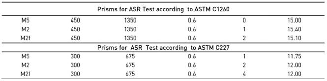This test was complemented with assessing volume changes up to one year, following the protocol of ASTM C227 [39]. Mortar prisms in size 40x40x160 mm, with cement-sand ratio 1:2.25 and water-cement ratio 0.6 were cast. Aggregates were prepared according to the requirements of particle size distribution established in the referred norm. A NaOH solution with a concentration 1.25% of the mass of the cement in the mortar mixture was used instead of plain water. Table 5 presents the proportions of each mortar in the expansion test.