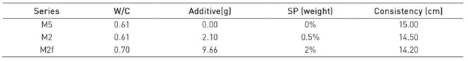 Table 7 presents the results of the evaluation of the properties in fresh state of the concretes. In all cases, it was observed the same tendency that in the mortar mixtures, that is to say, as the presence of fines in the mixture increases, more superplasticizer needs to be supplied in order to reach the same consistency. Similar results were obtained [12]. It was necessary an increase of the superplasticizer content in order to reach the fixed consistency The series M2of having the highest fines content demanded the maximum dosage of SP to reach the consistency planned for a constant W/C ratio. The negative impact of the fine on the rheology of the mixture is thus confirmed. There are, however, not significant differences in the content of air and the volumetric weight of the evaluated mixtures.