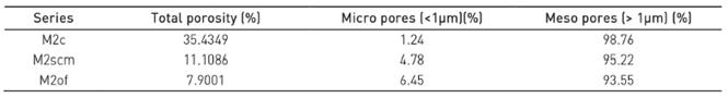 The highest total porosity at the cement matrix surrounding the grain appears at concrete M2c.The porosity is mainly distributed on the meso area, with only few pores on the micro area. This is consistent with the coarse porosity which is characteristic of a matrix with poor packing. M2scm has a total porosity which is 3 times smaller than M2C, and the amount of micro pores in reference to meso pores is much higher. This could indicate pore refinement caused by the fine grains under 63 µm which fill out gaps between cement grains. M2of, with more fines than M2scm, reaches the lowest porosity, 2 times smaller than that of M2scm and 7 times smaller than that of M2C. The percentage of micro pores continues to rise, and the number of meso pores is reduced. This indicates a clear pore refining effect produced by the increase of packing caused by the presence of extra fine particles.