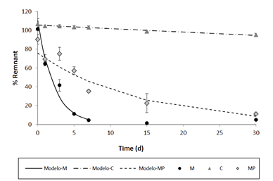The degradation rate of malathion was greater in the MS matrix than in the IC matrix, with degradation rate constants (k) of 0.662 d-1 and 0.445 d-1 respectively (p <0.005), and a half-life (t1/2 ) of 1.04 d (p <0.05, r2 = 0.67) for the MS and 1.9 d for the IC [Figures 1 and 2). The final degradation percentages were 96.4% for the IC and 95% for the MS. Degradation kinetics were fitted to the first-order models using the degradation values for the first 7 days in the IC (r2 = 0.97) and for the first 3 days in the MS (r2 = 0.93) because the highest degradation rates were observed during these periods of time.