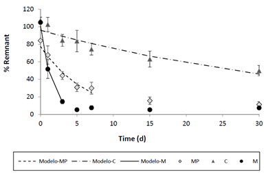 The methyl parathion degradation rate was also higher in the MS than the IC. The degradation rate values (k) were 0.162 d-1 for the MS and 0.0720 d-1 for the IC (p <0.005), and the t½ values were 2.8 d and 6.4 d for MS and IC respectively. The final degradation percentages were 92.5% for the MS and 89% for the IC [Figures 1 and 2). As with malathion, degradation kinetics were fitted to first-order models for the degradation data of the first 7 days in the MS (r2 = 0.76), since again it was when the highest degradation rate in this matrix was observed. The IC degradation kinetics were fitted to the first order model (r2 = 0.78) using the degradation values obtained during a 30-day monitoring period.