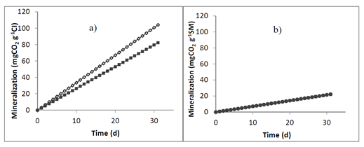 Assessment of the biological activity of the microorganisms in the matrices, and the toxic effect of the pesticides on them, were determined through a mineralization respirometry test. This was in accordance with the method described by [17], but with several modifications. Thus, the daily CO2 production in each microcosm assay was captured with 0.8 N NaOH, which was then titrated with 0.4 N HCl and phenolphthalein as an indicator. The CO2 formed Na2CO3, which was precipitated with 10% BaCl2. Microcosm assays were used without pesticide contamination as biological activity control tests. Later, mineralization was evaluated over a 30 day-period and tests were performed in duplicate.