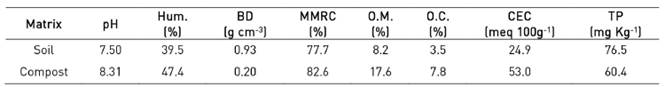 Degradation tests were carried out using two microbial matrices: 1) immature compost (CI) (with 5 days of activation conditions) produced by mixing organic waste (mainly from pineapple, banana, papaya and mango) and fine-grained sawdust at a 50/50 ratio (v/v); and soil from Moravia (MS) collected from the first horizon (first 10 cm), transported to the laboratory in plastic sterilized bags and immediately stored at 4 °C until the time laboratory tests were started. The matrices were dried at room temperature and passed through a 2 mm pore diameter sieve to determine their physicochemical properties: pH, humidity percentage, maximum moisture retention capacity -MMRC-, bulk density (BD), organic carbon content -OC- [13] [14], organic matter content -OM- [13] [14], cationic exchange capacity -CEC- and total available phosphorus content -TP- [15] [16].